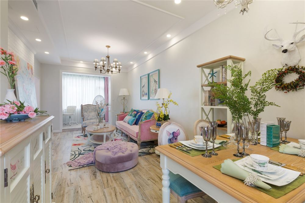室內客廳裝修效果圖,整個客廳選擇了簡歐簡潔,選線條圓潤,色彩豐富,用了自然綠和深藍來緩沖粉色沙發的跳躍感。