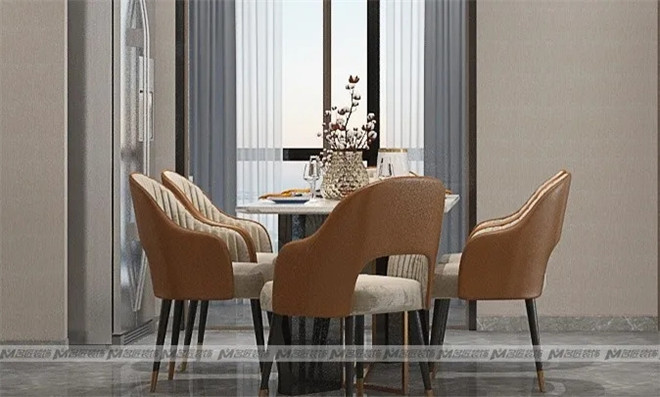 大理石電視背景墻,絲絨質(zhì)地的沙發(fā),輔以窗簾、幾何掛畫、圓形邊幾、擺件等軟裝搭配,不同材質(zhì)之間相互碰撞,又相輔相成,畫面一派和諧。