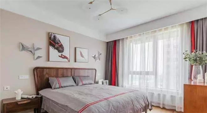 臥室的色彩要與主題相互呼應,這個沒有過多的色彩,布置和家具,沒有喧囂與繁復,一派寧靜悠遠,顯示出業主溫文爾雅,平和理性的特點。