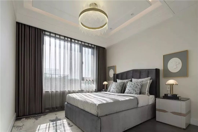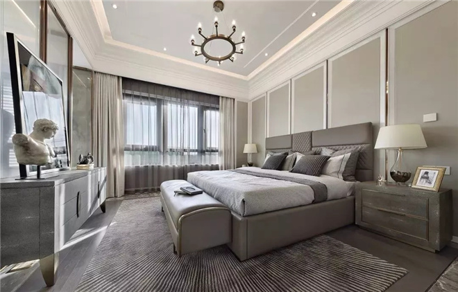 主臥室摒棄復(fù)雜陳設(shè),用簡約手法詮釋了一個舒適的空間環(huán)境。臥室內(nèi)沉穩(wěn)睿智的咖色家具與質(zhì)感極強的床飾,于細(xì)節(jié)處鍛造低調(diào)奢雅;藝術(shù)感十足的斷臂雕塑增添了空間的文藝氣息