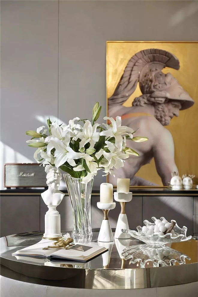 步入客廳,新貴的奢華感與典雅氣息迎面而來,熱烈卻不浮夸。在空間米灰色色調(diào)的基礎(chǔ)上,配置定制家具,其觸感舒適、線條強烈而精簡,大理石、金屬、皮質(zhì)、木飾等多種異材搭配,簡單中蘊含奢華。