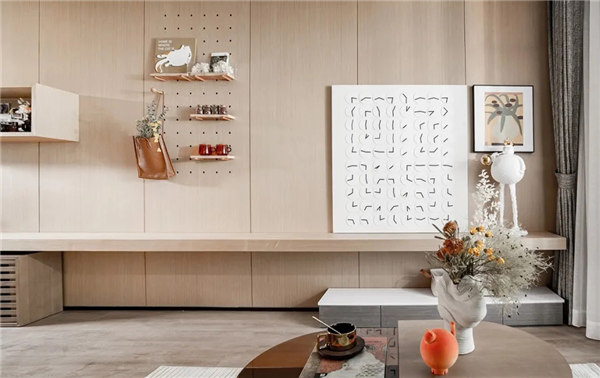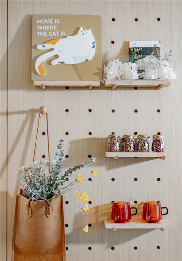 鋪設木質地板的客廳,搭配絨布沙發(fā),陽光,微風,綠植,空間充滿視覺層次感,在這里休憩也是一種放松。墻上的洞洞板、掛包里的干花,裝點出純粹質樸的生活。