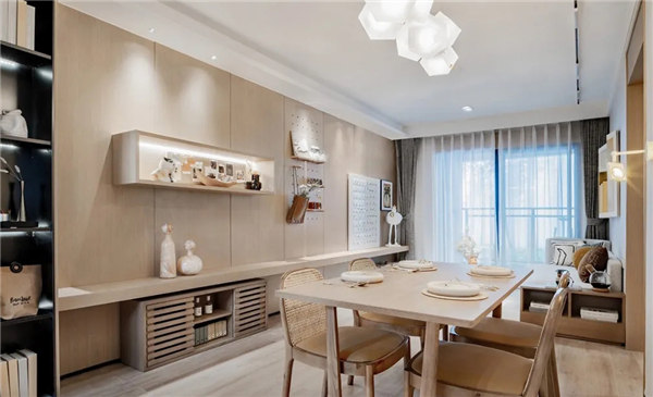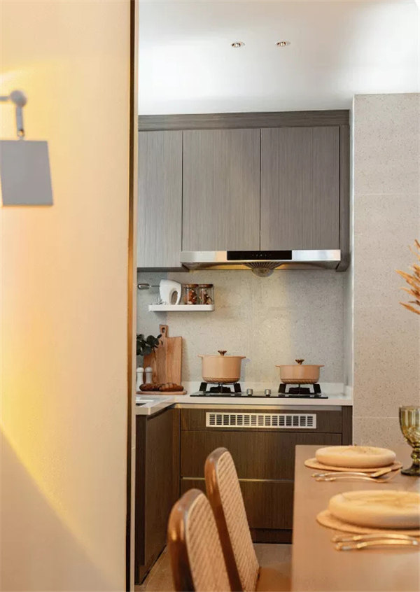 餐廳和客廳一體化設計,視野開闊,桌椅均使用原木材質,搭配綠植,透出幾分禪意。開放式廚房利用水磨石墻突出主體,去除繁瑣的設計裝飾。