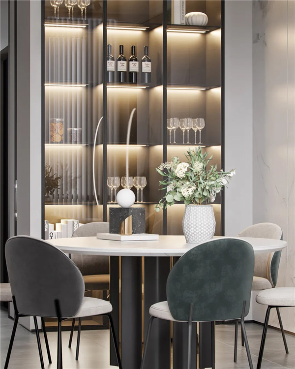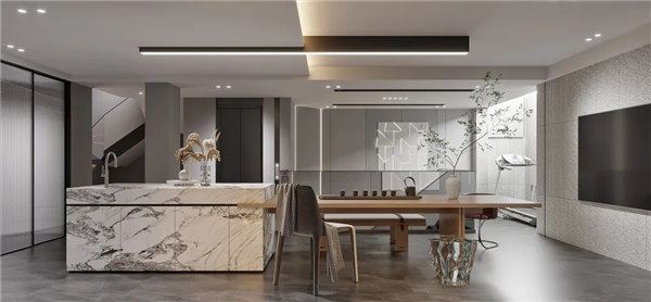 餐廳色調(diào)個(gè)性,以灰色餐椅搭配米白色坐墊,白色大理石臺(tái)面,搭配無主燈,與客廳遙呼相應(yīng)。撞色設(shè)計(jì)與線條交錯(cuò)有致,讓空間顯得飽滿,富有層次。不張揚(yáng)的奢華才是兼顧生活品質(zhì)與卓越風(fēng)范的展現(xiàn)。