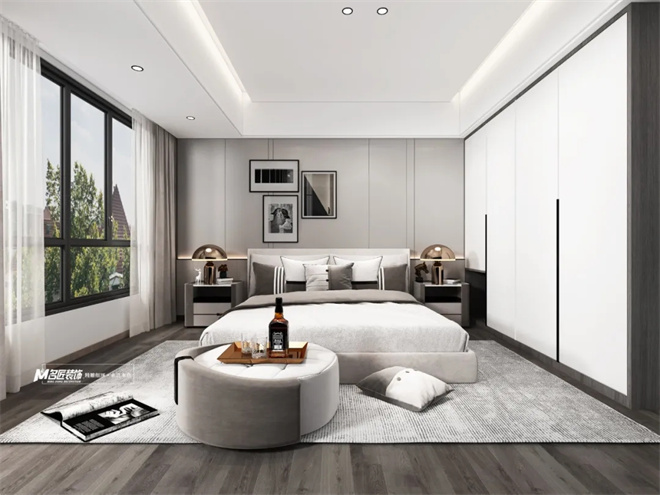 臥室中色彩靈活運(yùn)用,形成自然靈動又不失沉靜的環(huán)境,大面落地窗保證了空氣,光影與人動線的流暢性