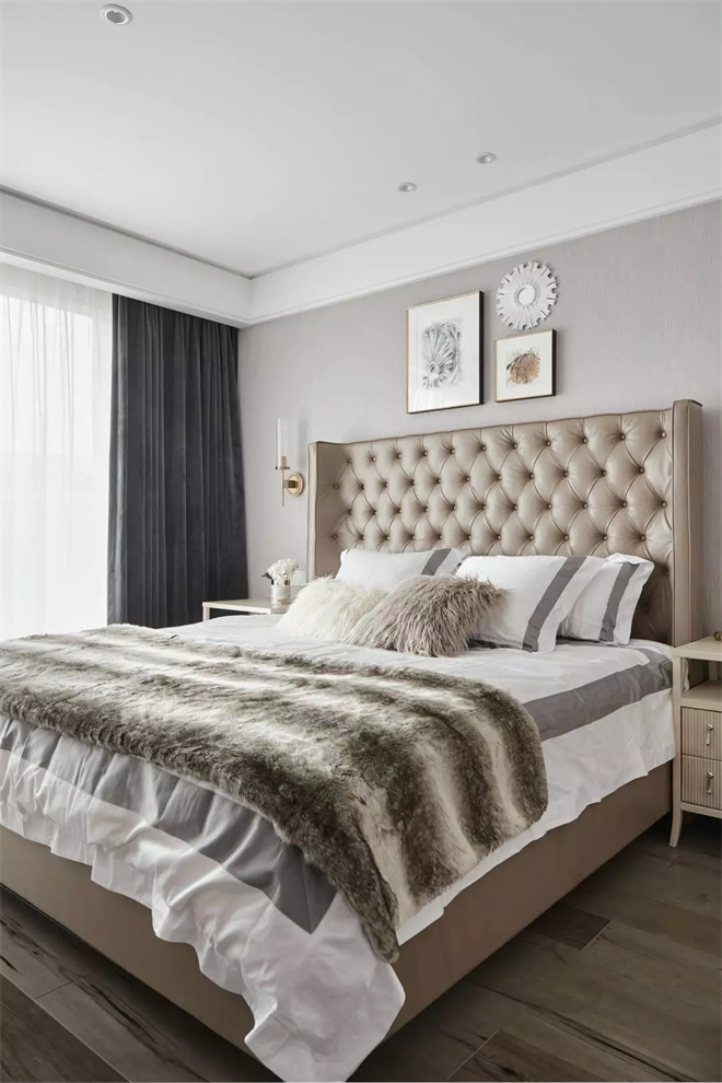 臥室延續了整體設計風格,淡雅的配色和精致的壁燈、裝飾畫,不經意間流露細膩獨特的設計心思