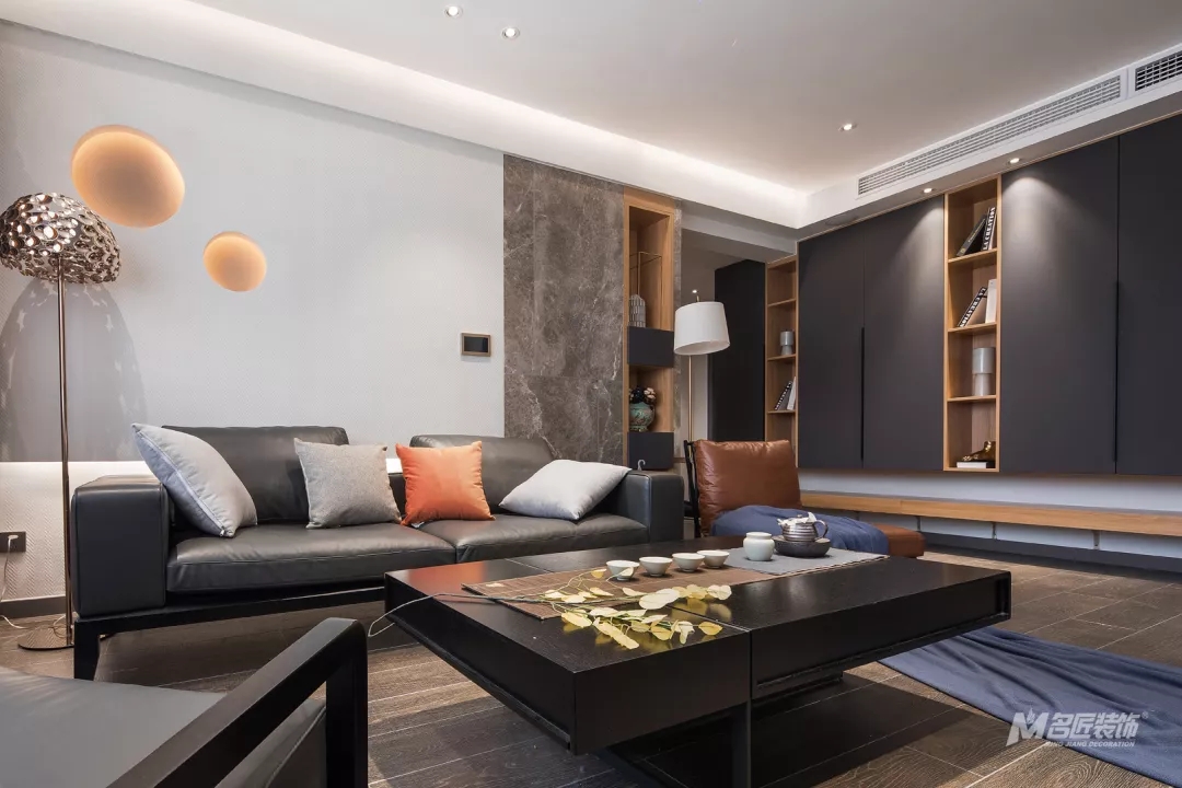 整潔清爽的客廳,由高級(jí)灰搭配著原木色、愛馬仕橙,時(shí)尚氣息濃郁,又有著自然的溫暖感受。