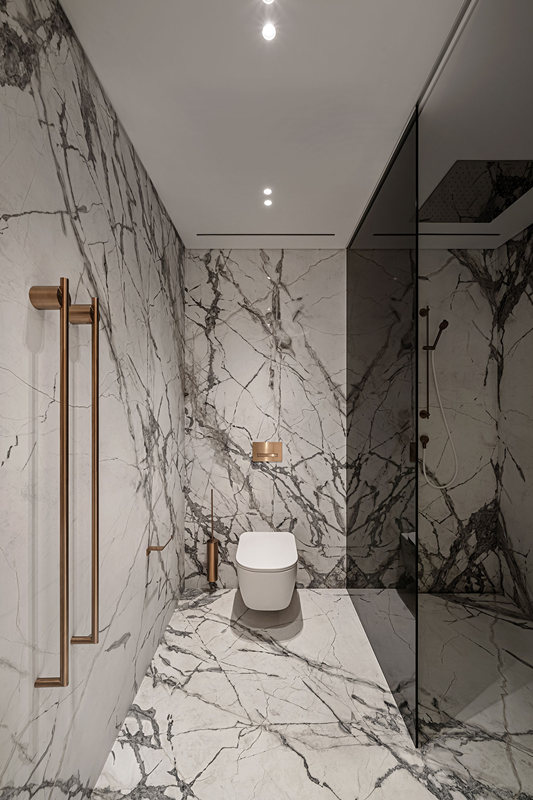 盥洗區的鏡子門后隱藏著“秘密空間”馬桶及淋浴區,前面地面均以大理石裝飾,方便清理。內嵌筒燈不占據空間,減少壓迫,同時又很好地營造出溫馨感。