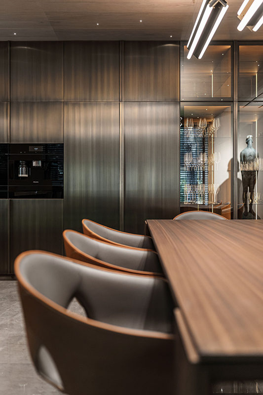金屬拉絲櫥柜大膽前衛,紋理細膩,搭配嵌入式烤箱,為廚房省出更多臺面的操作空間。