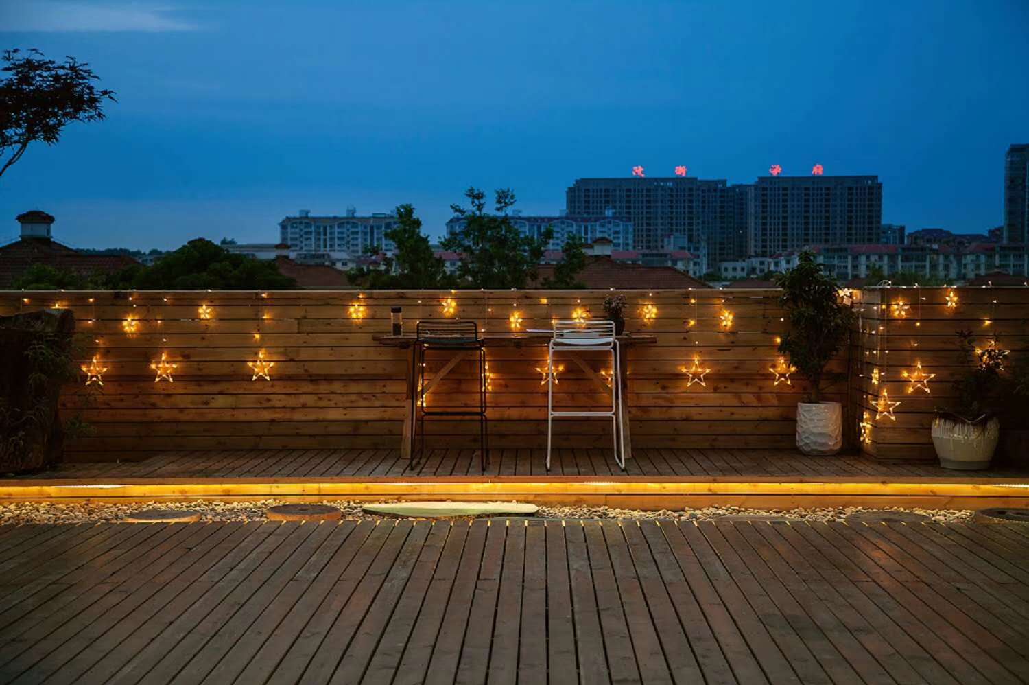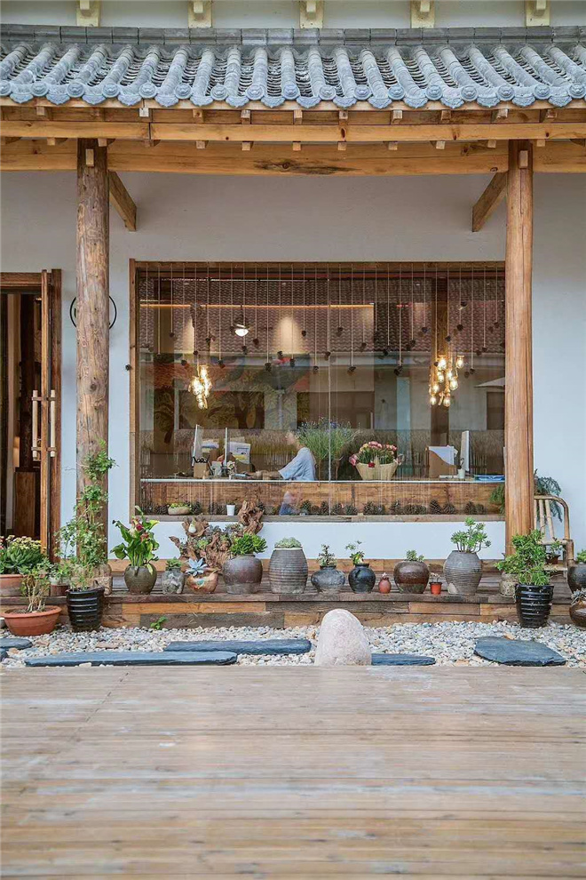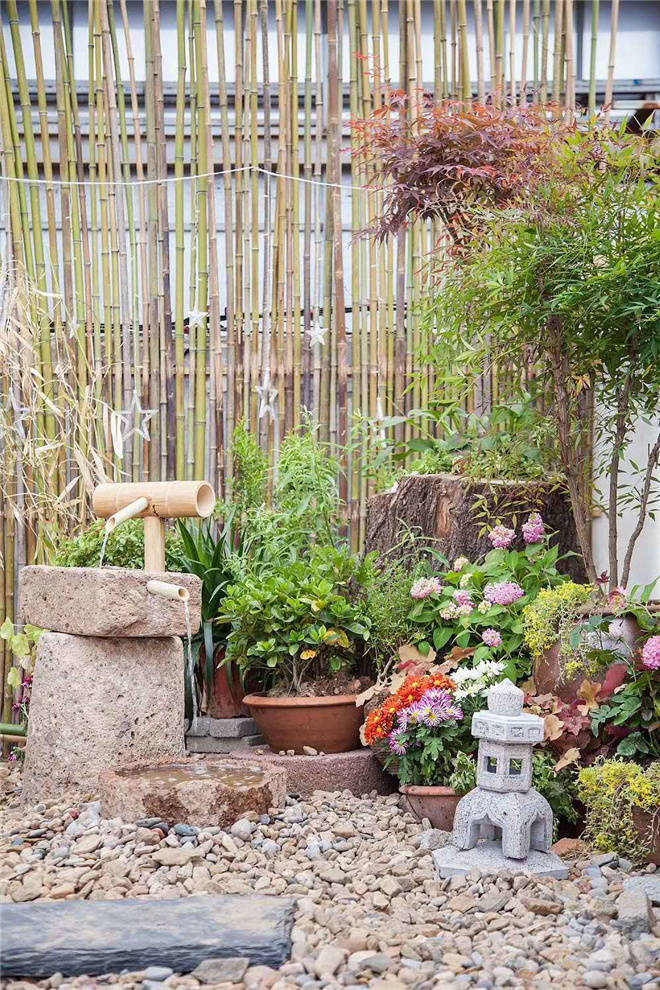 廣緣,蹲踞,石燈籠,石子,甲板地面,石板,原木桌椅,竹圍欄……平臺的搭建,簡潔的裝飾,休閑的長凳,花卉以及綠植.